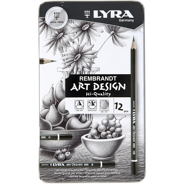 Lyra, premium quality, drawing pencils in grades 6B to 4H. Packed in a metal box.