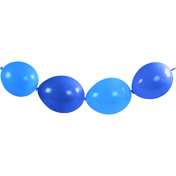 Solid coloured, round balloons in natural rubber. Each one has an elongation at the opposite end of the nozzle to connect with other inflated balloons, creating a chain.