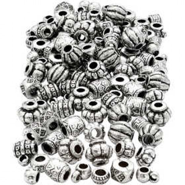 Versatile mix of plastic beads with embossed designs in a variety of sizes - some with a loop for hanging pendants or drops.
