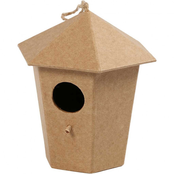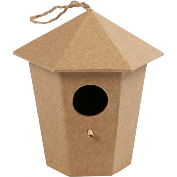 Bird house made from brown papier-mâché.