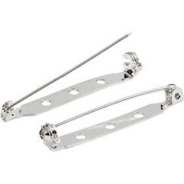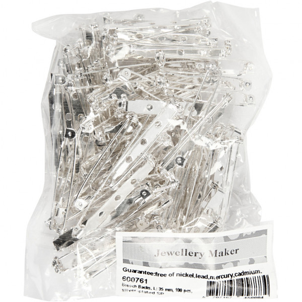 Brooch Backs, L: 35 mm, 100 pcs, silver-plated [HOB-600761]