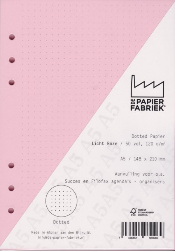 A5 Filling notes paper for example for: Succes, Filofax and Kalpa Calendars/Planners - A5 Size - 50 sheets (100 pages) - Dotted Light Pink coloured Paper - 120 g/m2. Price is per 50 sheets