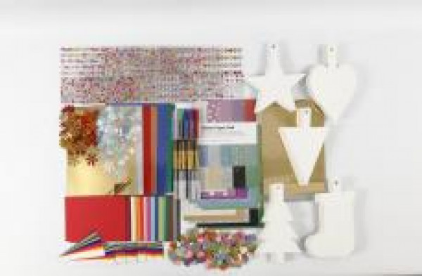 A set with creative materials to make decorations including templates for Christmas decorations that shine.