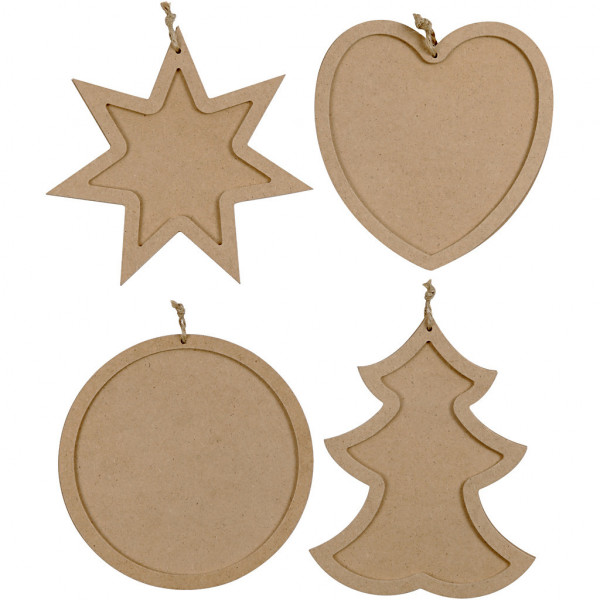 Frames with rear piece and hanging cord. Pack with 4 different designs.