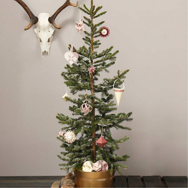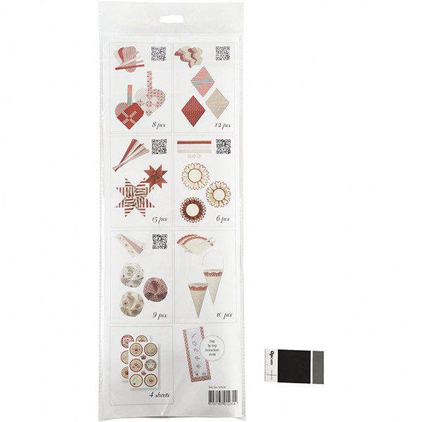 Contains material for: 8 asstd. braided hearts, 15 asstd. stars, 10 asstd. cones, 6 asstd. rosettes, 9 asstd. click ornaments, 12 asstd. diamond ornaments and 4 asstd. sheets of stickers for decoration.