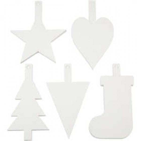 Die-cut card shapes (400 g) with a hole for hanging.