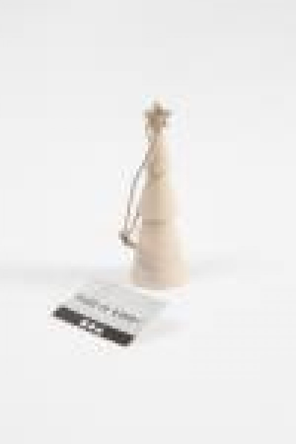 Christmas tree made of round cone in solid wood with star on top and suspension line.