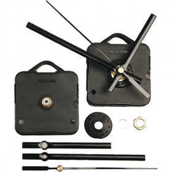 Battery operated clockwork mechanics with black hands. Can be mounted in a plate. Uses 1 pcs. AA battery (Item No. 14000 - not included).