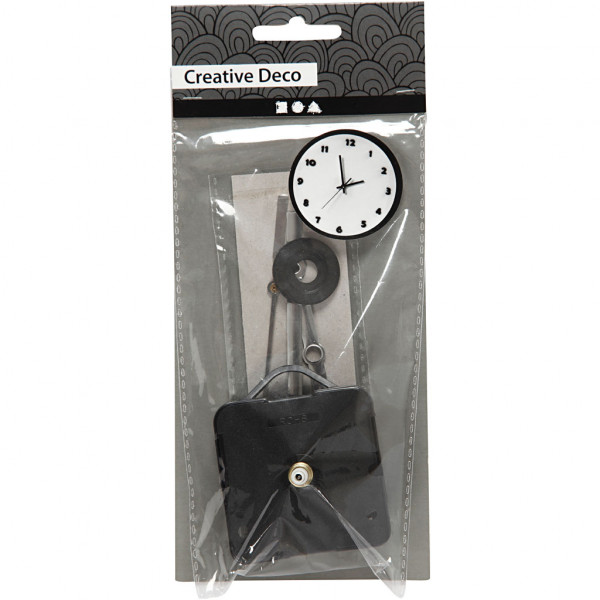 Battery operated clockwork mechanics with black hands. Can be mounted in a plate. Uses 1 pcs. AA battery (Item No. 14000 - not included).