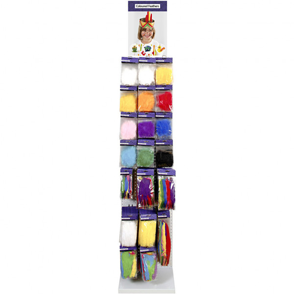 Content: 20 packs each of 12 different coloured feathers, 16 - 24 packs in 4 different sized feathers, and 20 packs each of 4 different colours.