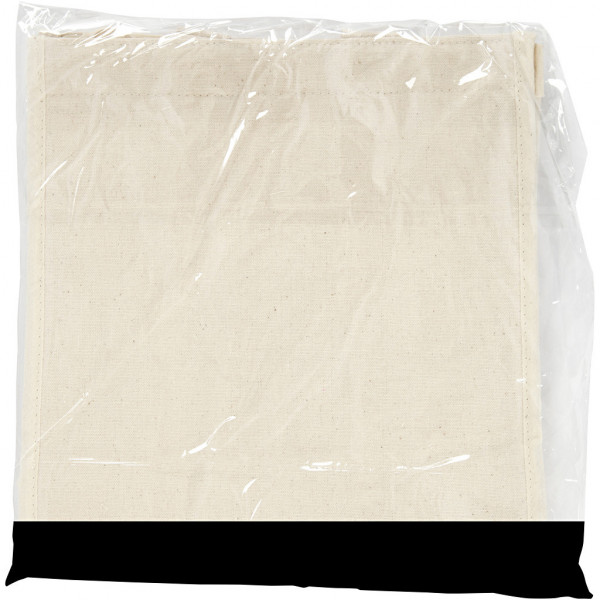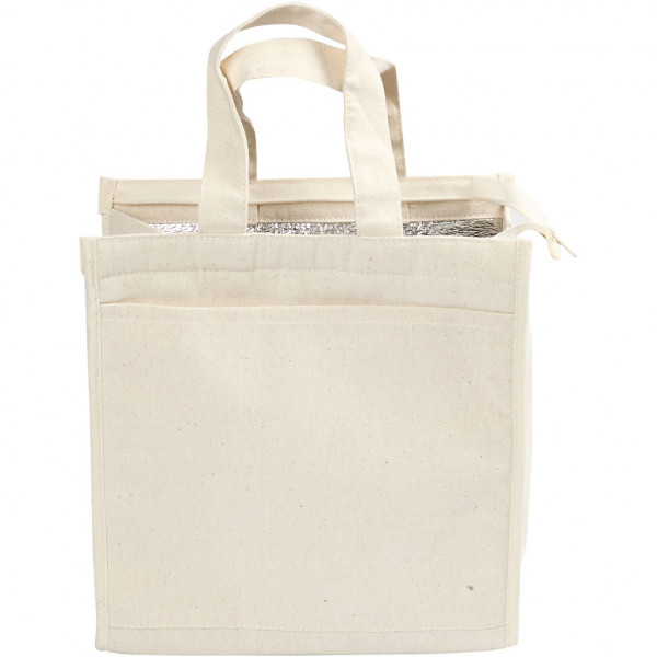 Small cooler bag with handles and zipper. The outside and the pocket of cotton. Can be decorated with fabric markers or fabric paint. The inside is covered with insulating foil.