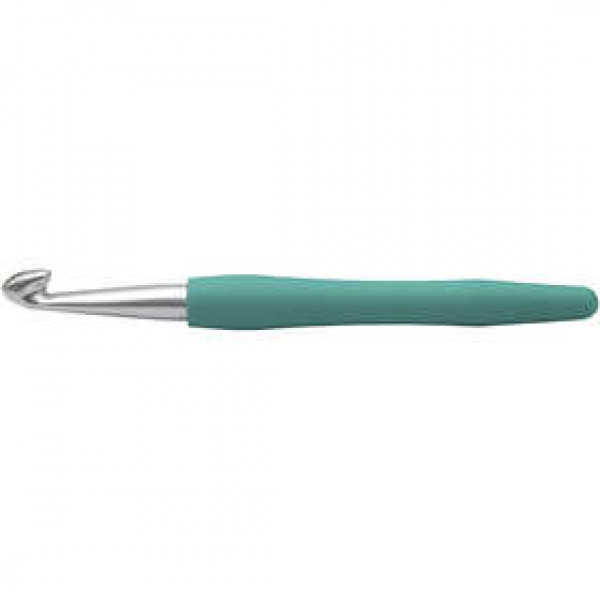 Ergonomic crochet hook of aluminum with soft touch plastic handle.