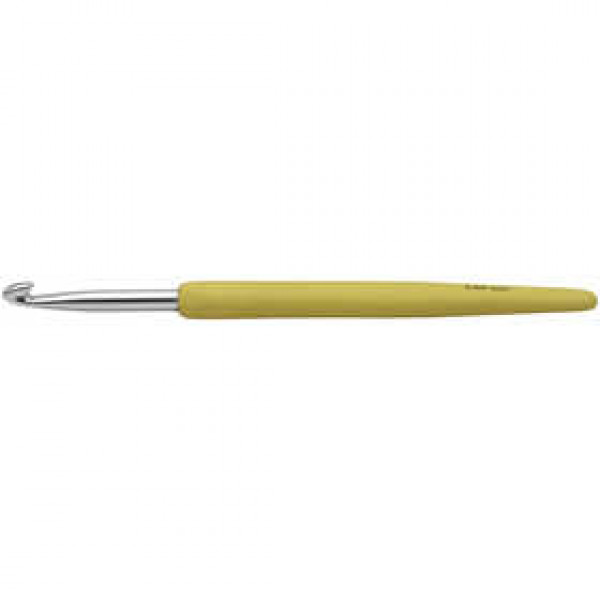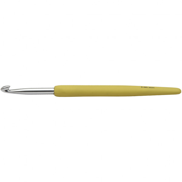 Ergonomic crochet hook of aluminum, with soft touch plastic handle.