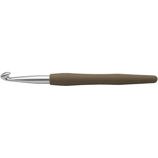 Ergonomic crochet hook of aluminum, with soft touch plastic handle.