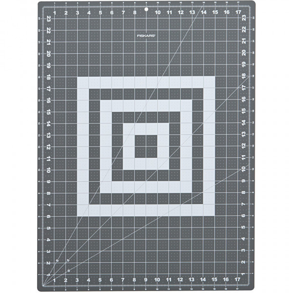Fiskars long-lasting, self-healing, reversible cutting mat with measuring grids in cm, inches and angle lines.