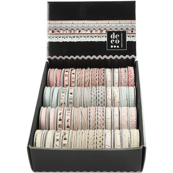 Range of decorative ribbon in display box.