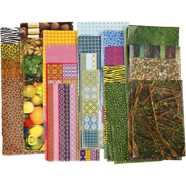 Assortment of single-sided, semi-transparent decoupage paper with prints.