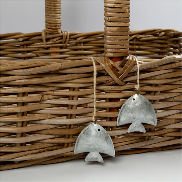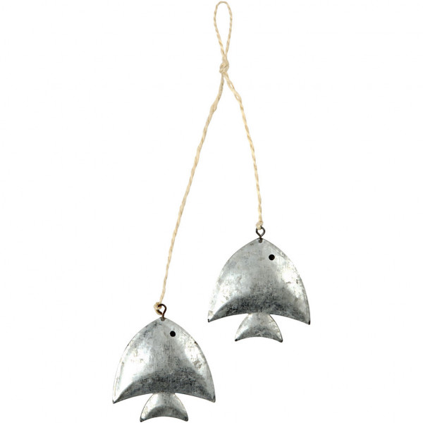 Galvanized ornament with a jute string for hanging.