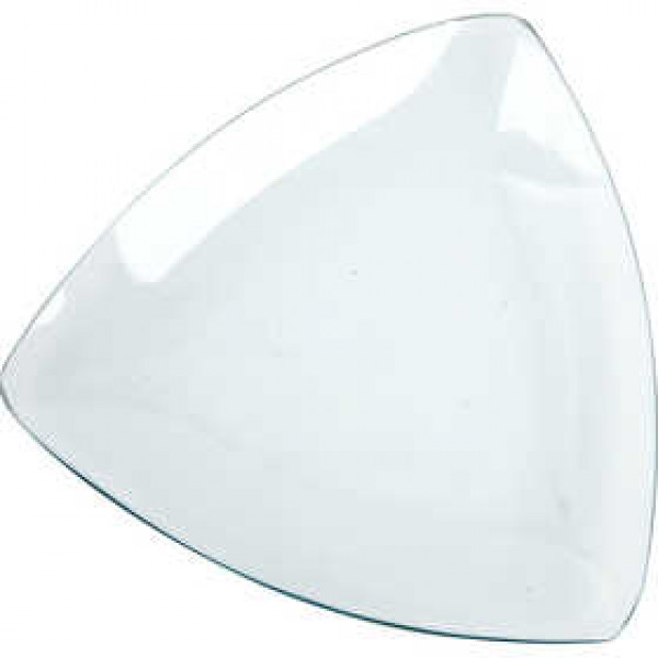 Triangular glass dish with curved edges.