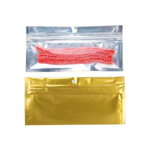 Our line of hanging zipper barrier bags have strong side seams, a heat sealable closure, and come stock without tear notches making them tamper resistant. The HZBB9CG bag has usable space measuring 50 x 50mm and comes pre-opened for efficient loading of your flavored, scented and food safe items. A 6mm round hang hole makes this a convenient option for the retail environment. The front panel is clear to display content while a gold backing provides space to illuminate your brand label or product details. Zip closure prevents airflow so your contents maintain freshness. Holds grams/capsules.