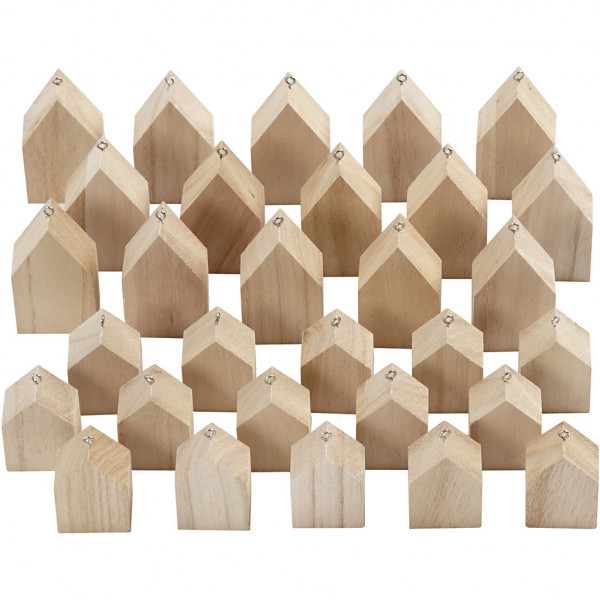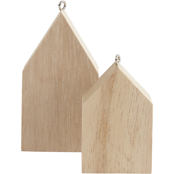 Small houses of light wood fitted with tiny eyelet in metal, for hanging.