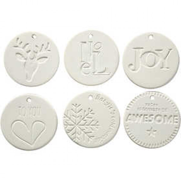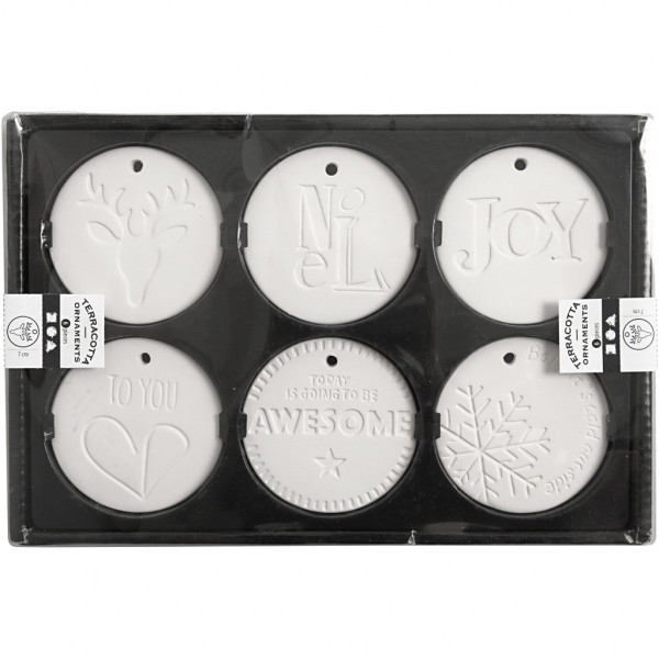 Ornaments made of white terracotta with a hole for a hanging cord.