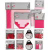 An assortment of items, in matching colours, to create invitations, place cards and place boxes including ribbon and decorations.