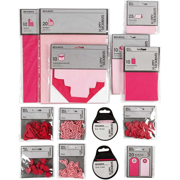 Contents: 15 packs of paper, card, and gift tags, 20 packs of satin decoration ribbon, 10 packs of paper, card and folding boxes, and 10 wooden decoration in different designs.
