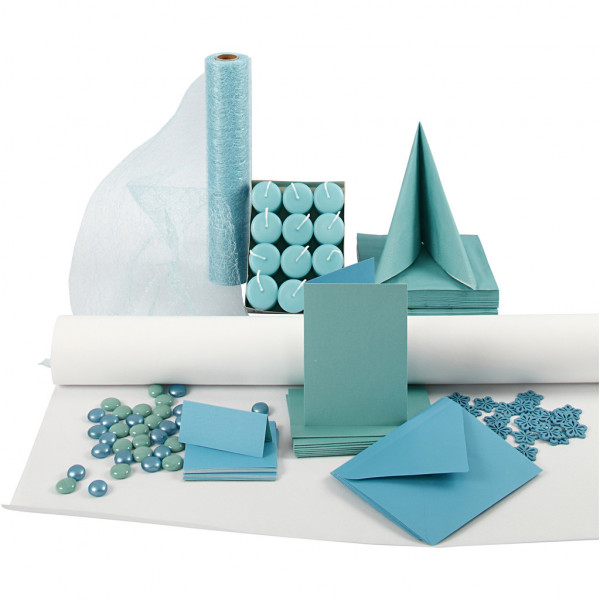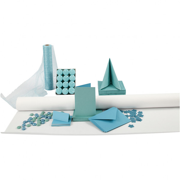 Contents: 10 pcs. cards, 10 pcs. envelopes, 25 pcs. place cards, 10 m table cloth, 10 m table runner, 12 pcs. candles, 20 pcs. napkins, glass decorations and wooden flowers.