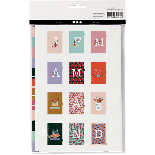 Decorative spreadsheets with printed 6-hole cardboard for 12-month split. Perfect for travelling- and creative journal. The partitions match the calendar covers 192648-192651.