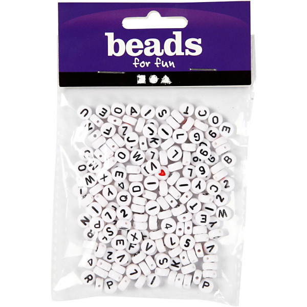 Round beads with the alphabet and number sequence. Made of white plastic with black printing on flat front and back. A sign at each bead (only red hearts).