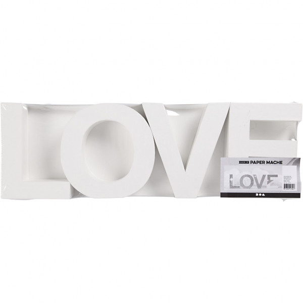 Words of molded letters in white cardboard.