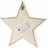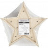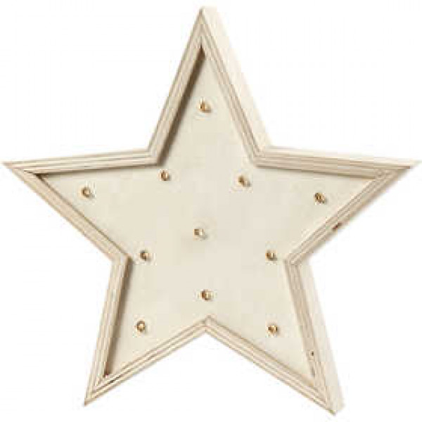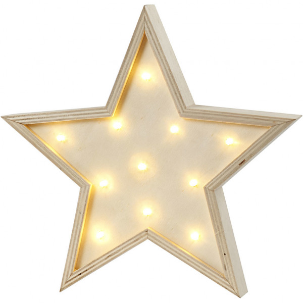 Freestanding star made of light wood with 11 integrated, small bulbs at the front, producing a golden light. has wall brackets for wall mounting, at the rear.