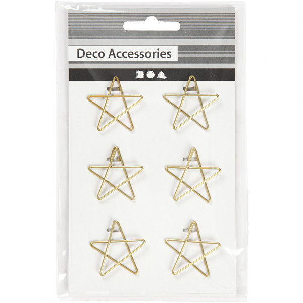 Clips in gold metal shaped like figures. Used both as normal. paperclips and as decoration on cards, gifts etc.