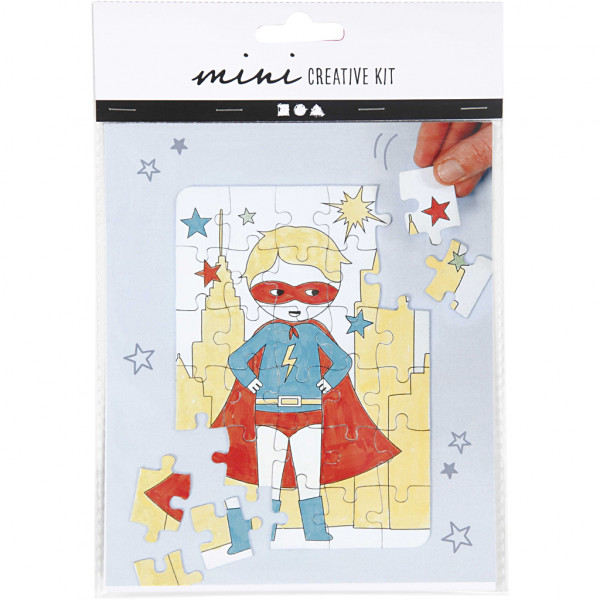 Material kit with jigsaw puzzle of cardboard with pre-printed motifs for decoration with markers. Inspiration included.