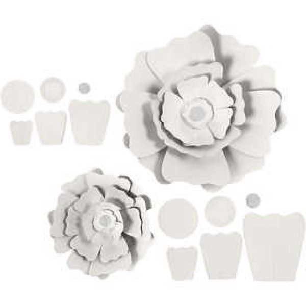 A set for 2 evenly-sized flowers, both containing different parts, stamped in structured card. Detailed instructions and double-sided tape included.