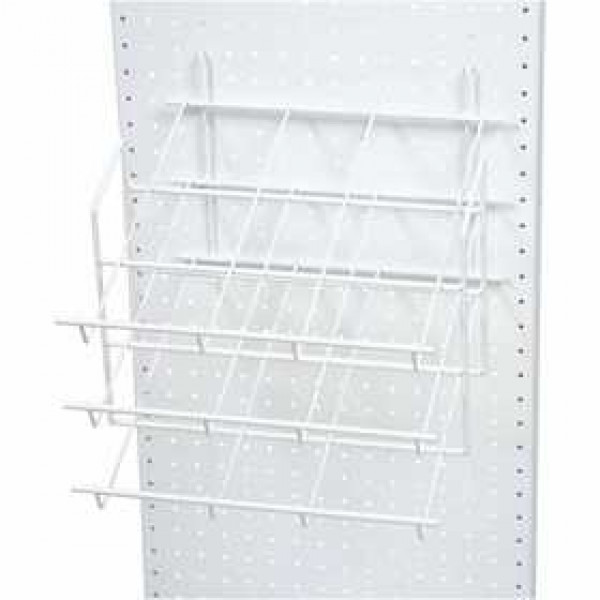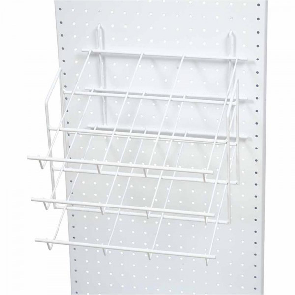White painted paper module with 3 tilted shelves that fits the Focus Display system.