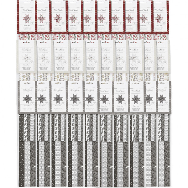 An assortment of two-dimensional multi-coloured paper strips in a design from Vivi Gade, with three collections in 4 designs of 2-sided printing and details in shiny metallic foil. Diameter indicates the finish stars' sizes. Instruction included.