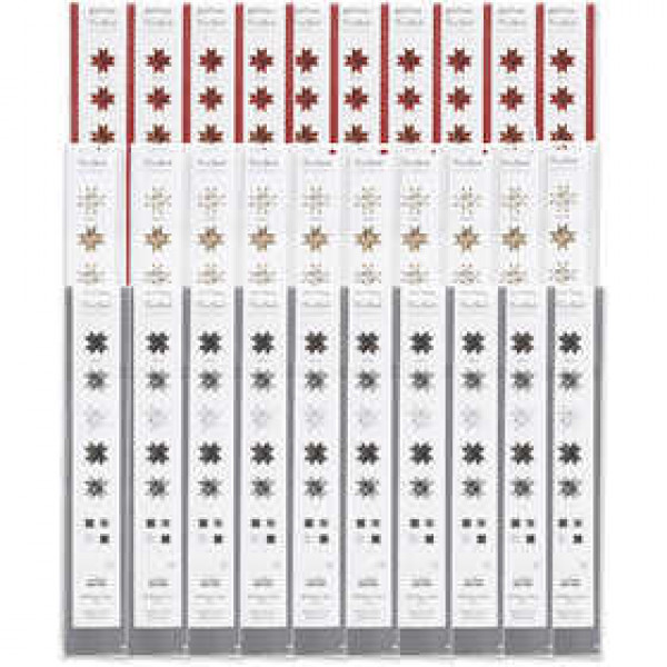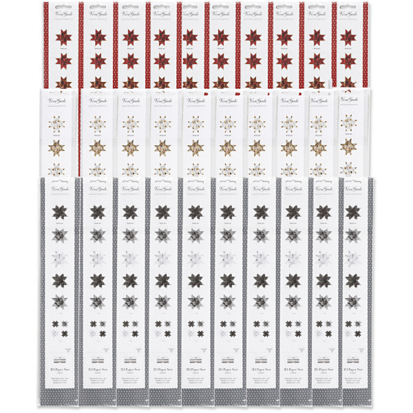 An assortment of two-dimensional multi-coloured paper strips in a design from Vivi Gade has three collections in 3 designs with 2-sided printing, and details in metallic foil, which highlights the stars' points Diameter indicates finish stars' size.