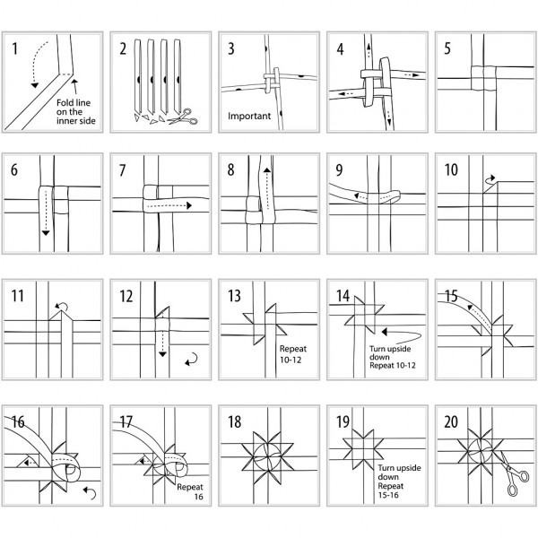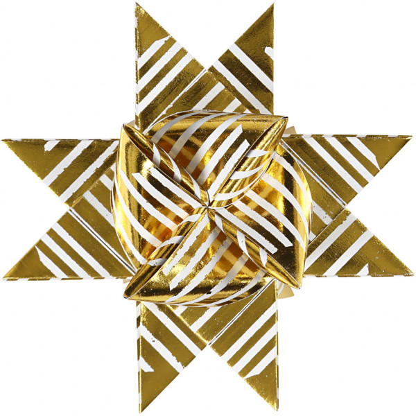 Traditional paper star strips in a design from Vivi Gade. The strips have the same color on both sides with pattern in partial foil printing, so each finished folded star appears metallic. Diameter indicates the finished star's size.
