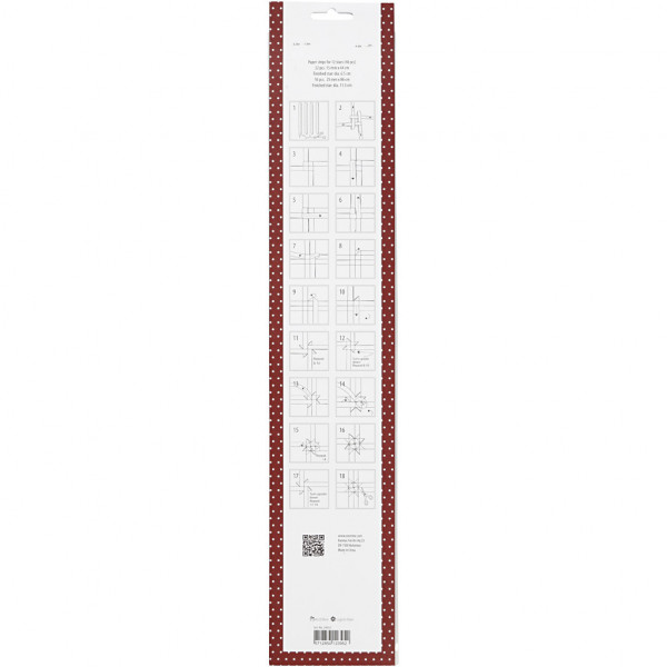 An assortment of two-dimensional multi-coloured paper strips with 2-sided paper in a total of four different designs with 2-sided printing and fine details in metallic foil. Diameter indicates the finish stars' size. Instructions included.