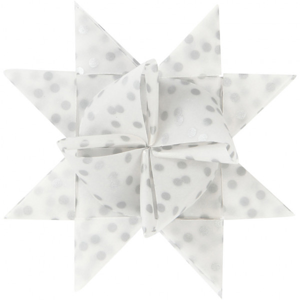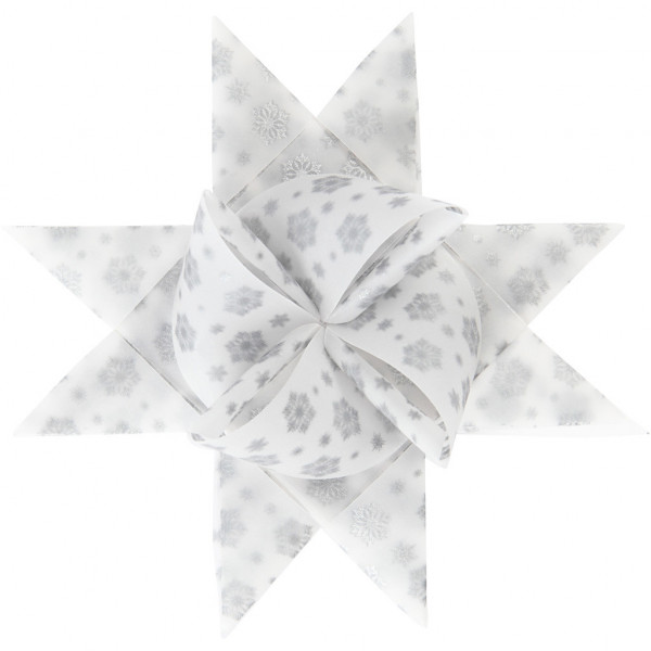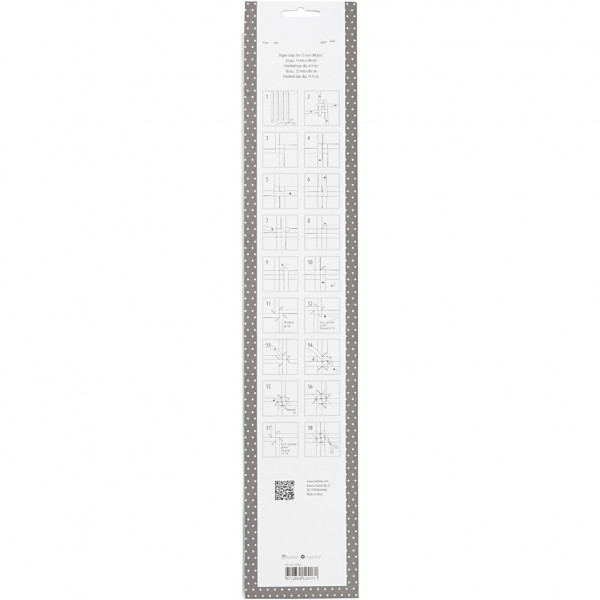 Strips of velvet paper for braiding stars in two sizes. Printed on one side with metallic colour with a design from Vivi Gade. Diameter indicates the completed stars' final sizes. Instructions included.