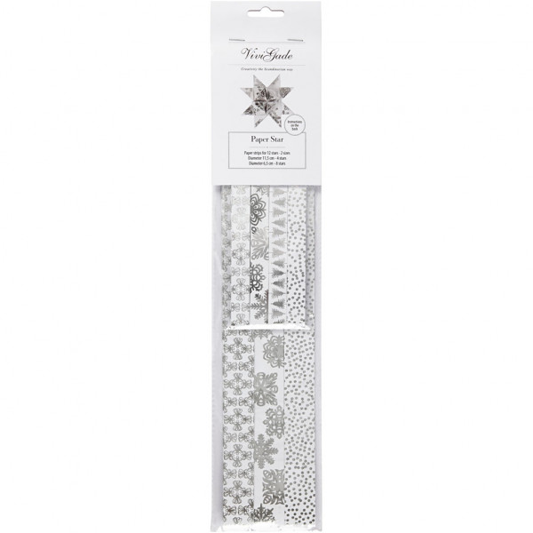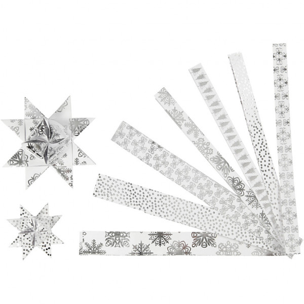 Paper star strips, W: 15+25 mm, D: 6.5+11.5 cm, 48 strips, white, silver [HOB-24360]