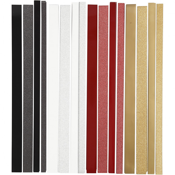 An assortment of two-dimensional multi-coloured paper strips in a design from Vivi Gade, for a total of 4 colours with lacquer and glitter on 2-sided printing. Diameter indicates the finish stars' size. Instruction included.