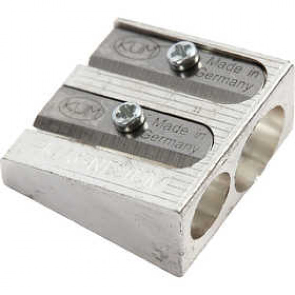 Double pencil sharpener in metal for both thin and thick pencils.