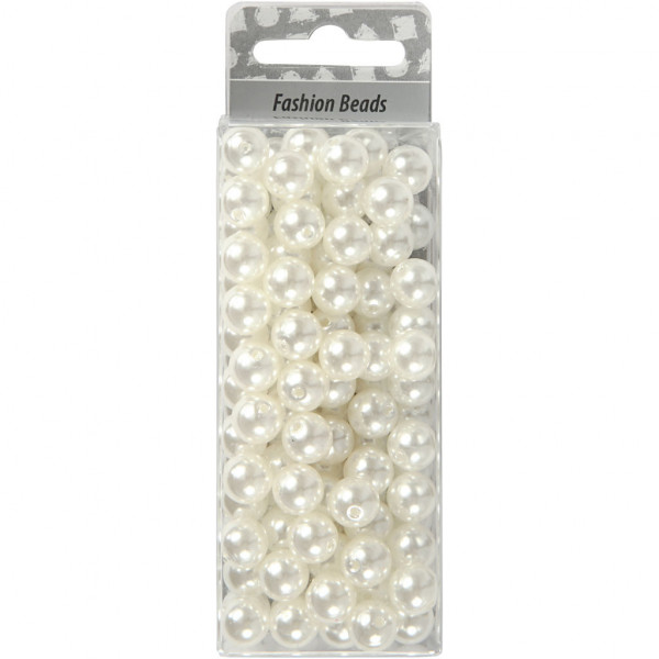 Round plastic beads in freshwater pearl look with lustrous sheen.