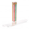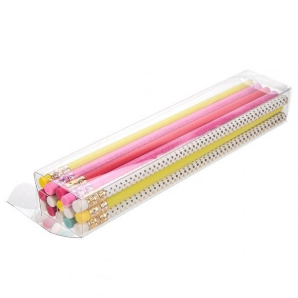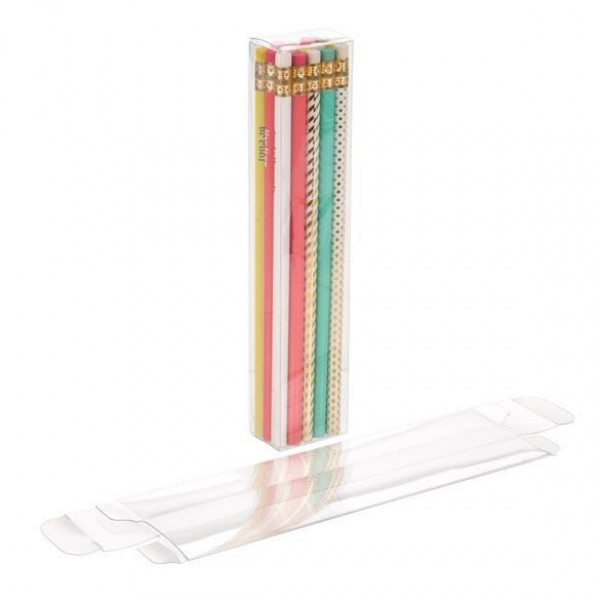 Our clear soft folding boxes are ideal for showcasing many types of products. FPB340 measures 38 x 25 x 191 mm and is unique for its long, slender dimensions. This box is the perfect size for 12 pencils. Package a line of gumballs, malt balls, or chocolate-dipped pretzels, beauty products, art supplies, and crafts. Made from durable PET material, this box is food safe and crystal clear. Boxes are easily assembled along soft fold lines. Clear stickers are included for a theft-resistant closure. Accessorize with a stretch loop for a finishing touch.