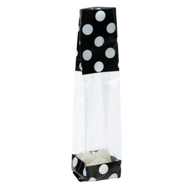 Are you looking for a cute way to package gifts and treats? The G1BW is our side gusseted bag that has a black with white polka dots print on the top and bottom. At 51 x 48 x 241 mm, this bag is a perfect fit for candy, gummies, wrapped chocolates, and more. The center of the bag is clear to reveal what's inside. The laminated material is 40 micron thick and provides a polished presentation to showcase your product. The bottom is sealed for added durability, so this package is not cute but reliable. Add a colorful ribbon or bow to accessorize and seal the bag. Printed gussets can be heat sealed for a more secure closure.