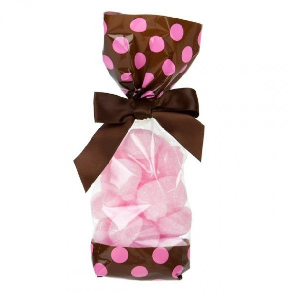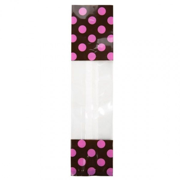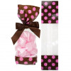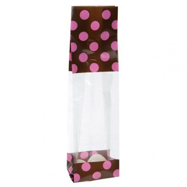 This gusset favor bag is designed with a chocolate brown with pink dots combination print. Ideal for treats and gifts, the G2BP measures 67 x 48 x 273 mm and is an excellent fit for chocolate, popcorn, confections, candy, toys, and crafts. This slender bag is also an excellent option for packaging cosmetics and beauty products. Expanding side gussets make room for bulky items while the bottom is sealed for extra durability. The material is 1.6 mil thick and laminated for an exceptional presentation. Dress up and seal this bag with ribbons, twist ties, or bows. For a more secure closure, this bag can be heat sealed with a standard hand sealer.