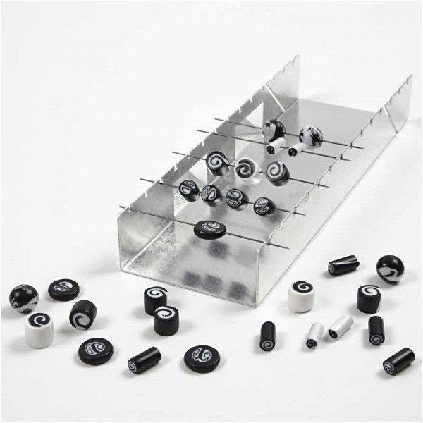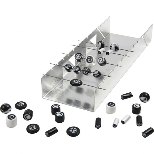 Contents: mitre box in stainless steel with cut grooves and holes for hanging pearl pins, acrylic plate, and 12 pcs. pearl pins.